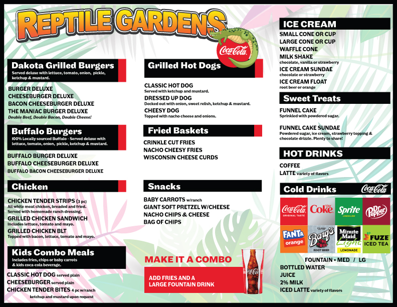 Between our animal shows, the Sky Dome, Cheyenne the Bald Eagle, the Prairie Dog Town, Spring Creek Gulch, and Tortuga Falls, you’re going to need some time to take a break and refuel during a long day of exploring Reptile Gardens. We’ve got you covered! Visit the Green Parrot Cafe or the Cola Cabana where you can take a break and refuel with some delicious food! Our menu features buffalo burgers, The Maniac burger, Indian Tacos, refreshments, funnel cakes, and ice cream.